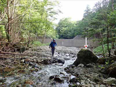 闇隅沢 4やっぱり多いや…。前回は堰堤を超えて直ぐ河原でしたが、今回はプール状態になっていて淵沿いにを巻きました。矢印の岩に注目!2025年9月23日撮影 |