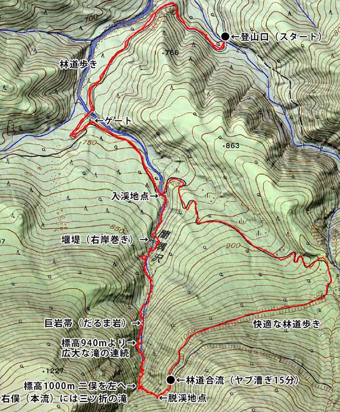 <2025年9月23日(祝)> 行動時間 3時間45分(休憩時間含む) 登り:2時間20分 / 下り:1時間25分 登山口(6時35分)~入渓地点(7時5分)~940m(8時10分)~1,000m二俣(8時35分)~脱渓地点(8時55分)~林道(9時10分)~車デポ地(10時20分) |