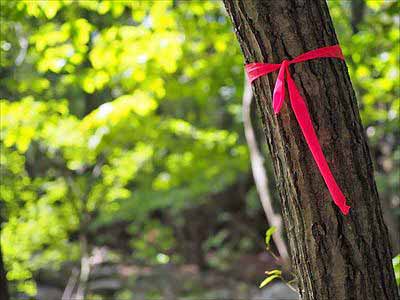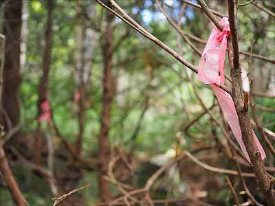 五葉山 大沢 10標高930mにて最後のピンクテープ。これ以降、道は消失しますので、沢を遡行していきます。2025年9月27日撮影 |