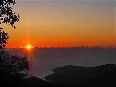 五葉山 大沢 44翌朝、小屋の窓から差し込む光で目を覚ますと、ちょうど日の出の瞬間。慌てて外に飛び出すと、水平線から太陽が昇る神々しい光景が広がっていました。2025年9月28日撮影 |