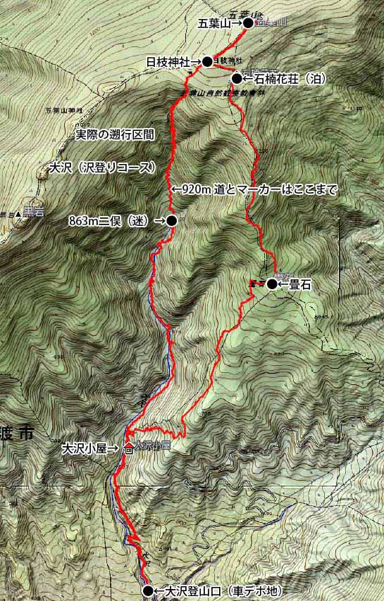 <2025年9月27日(土)> 行動時間 4時間30分(休憩時間含む) 大沢登山口(9時50分)~大沢小屋(10時15分)~675m二俣(10時40分)~863m二俣(11時30分)~日枝神社(13時50分)~五葉山(14時5分)~ 石楠花荘(14時20分)泊 <2025年9月28日(日)> 行動時間 2時間(休憩時間含む) 石楠花荘(6時5分)~畳石(6時50分)~大沢登山口(8時5分) |