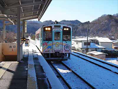 三陸海岸 自然歩道 6譜代駅:10時24分発の電車がやって参りました。これに乗車します。可愛いイラスト一杯の電車に癒されます。2025年12月27日 |