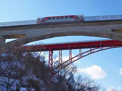 三陸海岸 自然歩道 15先の大沢橋梁(おおさわきょうりょう)を今度は真下から望みます。ここで電車は1分間停車しオーシャンビューを満喫出来ます。ちょうど良いタイミングで電車が停まってくれました。2025年12月27日 |