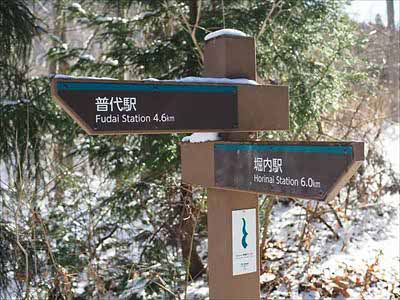 三陸海岸 自然歩道 21この積雪状況では本コース最大の難所である山越えの沢登りは危険と判断し、無理せず迂回ルートを選択しました。「沢登りコース」の分岐にて。分岐入口に「クマ出没注意」の案内板がありました。2025年12月27日 |