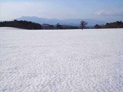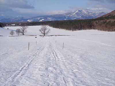 春子谷地と鞍掛山 3歩き出してすぐ、空一面の青。広大な牧場の雪原は朝の冷気でカチコチに締まり、まるで舗装路のような歩きやすさです。雪を踏みしめる音だけが響く静かな世界に、自然と気持ちも軽くなります。2026年3月1日撮影 |