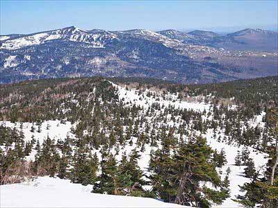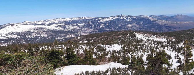 八幡平 源太ヶ岳 23左から茶臼岳~恵比須森~大黒森~屋棟岳~西森山~前森山です。2026年4月25日撮影 |