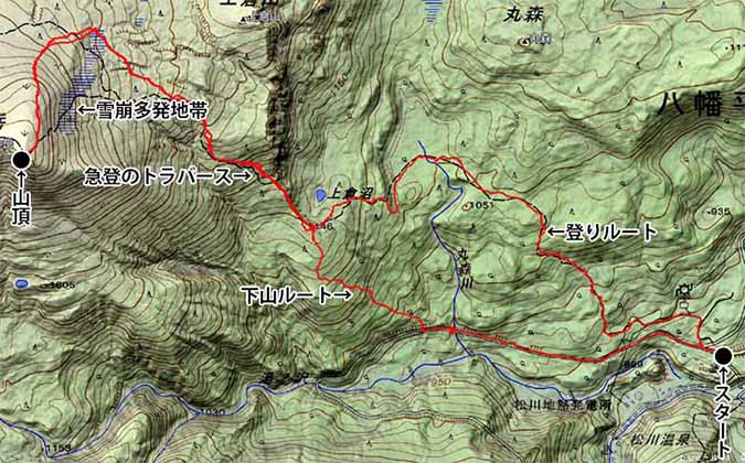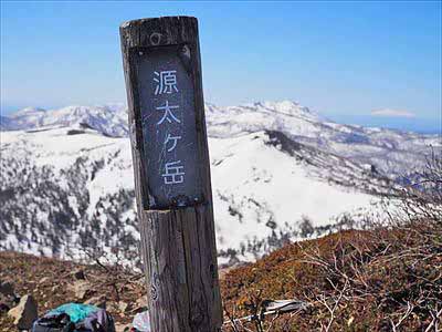 八幡平 源太ヶ岳 16山頂が見えます。直登は雪崩の危険があるため、北尾根に回り込んで登ります。地元では雪崩多発地帯の山で有名です。主に山頂直下東側斜面が雪崩やすいようです。2026年4月25日撮影 |