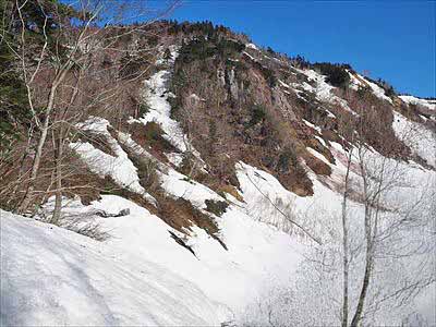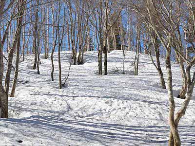 八幡平 源太ヶ岳 15写真では傾斜が緩く見えますが、実際は急です。慎重にトラバースします。強いて言えば、ここが核心部かも?2026年4月25日撮影 |