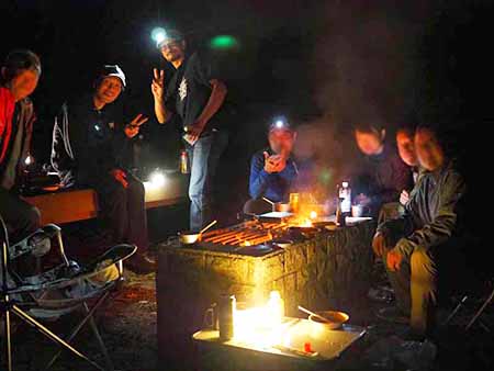 声をかけてくださった主催者の東北遡行同人ゴルオヂのmooreeさん、北上山岳会の守護神 tbfさんには感謝しかありません。今回は8名というこじんまりとした集まりでしたが、サプライズで団栗林さんも参加!焚き火を囲み、焼肉と秋刀魚を味わいながらの山談議は、まさに至福のひとときでした。