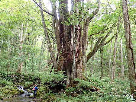 今回の山行は、東北の沢ヤ仲間たち総勢8名での交流会の一環。前夜祭の興奮も冷めやらぬまま、いざ入渓!最初は単調なゴーロ歩きが続きますが、歩き始めてわずか20分。突如として、私たちの目の前に息をのむような光景が広がりました。天を突くようにそびえ立つ巨大な桂の木。その圧倒的な存在感にメンバー全員が「すごい…!」と声を失います。樹齢はいったい何百年だろう?こんな巨木に出会えるなんて「この沢に来て良かった!」と心の底から感じた瞬間でした。