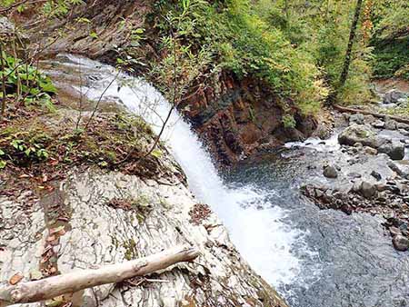 歩き始めて1時間ほどで、キラキラと輝く「6mの滝」が出現。中央の岩肌を快適に登っていくと、その先にはなんと70mも続く長大な「ナメ床」が!滑らかな岩肌を清流が流れ落ちる様はまさに癒しの光景で、沢歩きの醍醐味がここに凝縮されていました。
