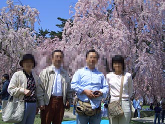弘前城の桜 4手前は7つ下の弟で後ろに背後霊の ようにいるのが1つ上の兄です。 弟はこれでも?痩せようとダイエットに 懸命に励んでいるようです。家族の話題は、もっぱら弟を痩せさせる 方法で盛り上がっていました。 母は黒酢を勧め、兄はエアロビを勧め、 私は登山を勧めています。 2005年5月4日撮影 |