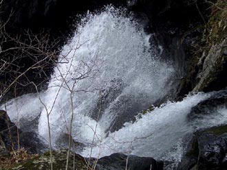 早池峰 七折の滝 14これは、滝の上部まで登り、滝頭から 撮影したものです。噴水部の迫力を ご理解いただけるかと思います。「汚れた洗濯物をこのジェット水流で 綺麗に出来るだろうなぁ~!」 なんて、考えていた私でした。 2005年4月10日撮影 |