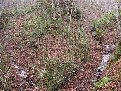 白根沢(南昌山) 1南昌第一トンネル手前の林道より白根沢へアプローチします。今回のバリエーションルート、実は2021年2月11日にも挑戦しているのですが、その時は深雪と絶壁に阻まれ予定ルートを登れず尾根より登りました。「無雪期に登ったらどんな感じなんだろう?」って思い、この度 再チャレンジしてみました。2023年11月23日撮影 |