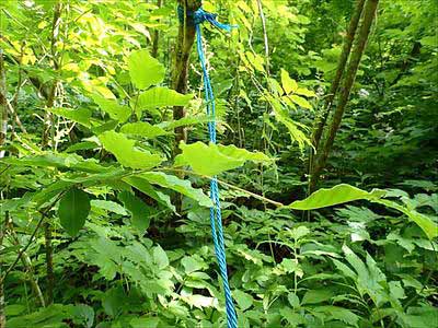 キッツ川左俣(640m支流) 20の高巻き途中に4mmのシュリンゲロープがFIXされていました。釣り師によるものでしょうか?2024年6月29日撮影 |
