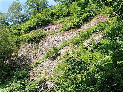 キッツ川左俣(640m支流) 41標高730mより右岸の絶壁を望みます。2万5千分の一地形図のガレマークの部分です。2024年6月29日撮影 |