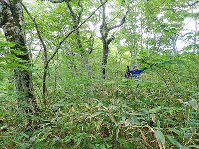 キッツ川左俣(640m支流) 60P1132の東側コルに到着しました!ここもヤブガ薄くて助かりました。ここより北西方向にトラバースしながら(ヤブ漕ぎしながら)沢を目指します。2024年6月29日撮影 |