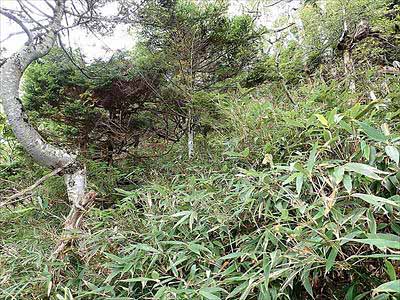 大作沢右俣 14標高1390mまでトラバースして、今回はここまで!この笹ヤブを漕ぐのがシンドそうだったので…。あと20分もヤブを進めば本流の沢と合流したと思われます。2024年9月16日撮影 |