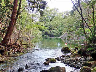 闇隅沢 52ヶ月前はこんな感じで堰堤がハッキリ出ていて丸見えでした。さらに矢印の石の場所を見ても増水の具合が分かります。2025年9月23日撮影 |