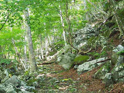 五葉山 大沢 47下山は、大沢ルート。緑がとても美しく感動モンでした。わずか2時間で登山口に到着し、午後の仕事にも余裕で間に合いました。たまには山小屋泊まり、いいもんです。2025年9月28日撮影 |