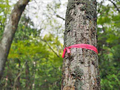 五葉山 大沢 10標高930mにて最後のピンクテープ。これ以降、道は消失しますので、沢を遡行していきます。2025年9月27日撮影 |