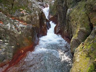 岩手山 焼切沢・中流部 33赤い岩とコバルトブルーの水の色にウットリ♪ もっと遡行されてよい沢だと思いました。本日遡行した感じでは、グレードは2級か 2級上位だと思います。水線に忠実に遡行 すれば、3級くらいになると思います。 2014年10月19日撮影 |