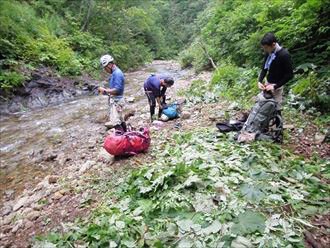 小出川 中~上流部 1今年6月20日に仲間4名で小出川の下流部~ 中流部を遡行し、栃川~ツナギ沢から岩手県側 の仙北街道を通り胆沢ダムへと周遊しました。その夜の酒宴の席で「今度は中流部~上流部を 遡行しぜひ東山(とうざん)の山頂に立ちたいね!」 と約束しました。 豊ヶ沢林道終点にて。これから仙北街道 (秋田県側)を小出川目指して縦走します。 2015年9月5日撮影 |