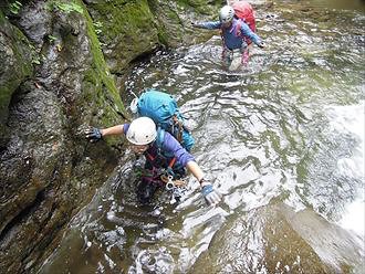 小出川 中~上流部 37ここは深くボルダーチックに突破するAさんです。2015年9月6日撮影 |