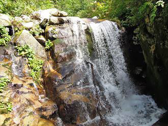 和賀山塊・高下川 6760mに掛かる5mほどの小滝。 740mの右岸枝沢を過ぎたあたりから 小滝が連続し楽しませてくれます。2016年9月11日撮影 |