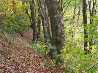 信倉沢~後ろのツル道 12最後のツメは数分のパヤパヤの軽いヤブ漕ぎで ブナ見平付近の登山道に出ました。六郷ダムの駐車場から3時間でブナ見平に ツメ上げていますので、後ろのツル道から登るのと そんなに時間の差はないと思いました。 2017年10月15日撮影 |