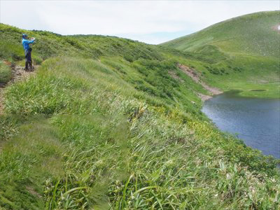 鳥海山 檜ノ沢 43鳥海湖は、鳥海山7合目の御浜付近にあるカルデラ湖です。写真撮影に励むSさんです。2018年8月18日撮影 |