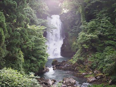 鳥海山 檜ノ沢 61その金峰神社の中にある奈曽の白滝です。待ち合わせは、御所野のイオンモール秋田に朝8時です。キャンプ場から72キロ 1時間35分も掛かります。2018年8月19日撮影 |