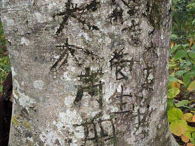 赤水沢左沢~赤水峠 22その往来の記録は、ブナの幹に入れたナタ目書き(祈り、家内安全)として年月日や名前が刻まれていました。特に赤水峠付近は、奥森吉と奥阿仁地区の往来の合流点であったため古い刻みが多く見られるようです。2019年10月16日撮影 |