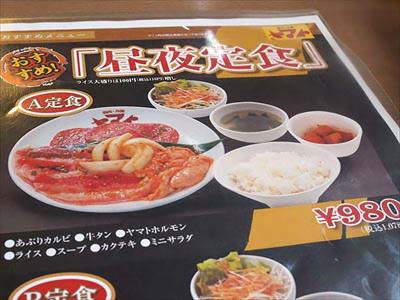 愛染山・大祝沢 16あぶりカルビ、牛タン、ヤマトホルモン、ライス、スープ、カクテキ、ミニサラダがセットでお得感があります。2021年6月6日撮影 |