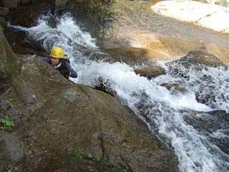 八幡平 大深沢・湯ノ沢 23上の写真の滝を登るS嬢です。 ここは出だしの部分で、お助け紐を出しました。 最初の一歩がちょっとボルダームーブです。クライミングをしていると、こういう時に 役に立ちますよね♪ 2007年6月17日撮影 |