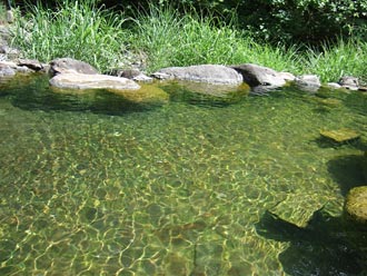 八幡平 大深沢・湯ノ沢 7これが噂に聞いてた大深沢の「野湯」です♪ なかなか立派な露天風呂でしたよ。 湯加減もいい感じでしたし…。今度来るときは、ここでひと風呂浴びて みたいものですね♪ 2007年6月17日撮影 |