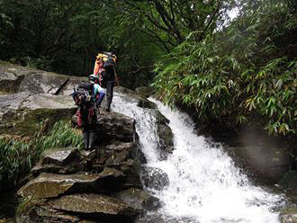 安達太良山 烏川左俣 7魚止滝は登れず、左岸より 遊歩道を利用して高巻きます(容易)。2012年9月29日撮影 |