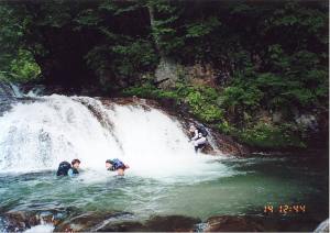 ウォータークライムの定番、水泳登山の 実践訓練に最適な沢!あまりにも有名な沢 これは「手取淵」幅2M長さ40Mの ゴルジュ。見よ!このジェット水流!