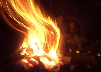 二口山塊・大行沢 前夜祭これは2004年6月下旬に行った時のもの。 前夜祭風景です。焚き火を前に酔いどれる 仲間達! 酔いどれ絶好調!そして、次の日は二日酔いに…。2004年6月撮影 |