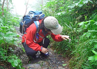 早池峰山の登山道にてここ岩手は高山植物の宝庫です! 登山道のあちこちにも綺麗な高山植物 で一杯! 「なんて可愛くて綺麗なんだろう!」 って花を愛でるK嬢2004年6月撮影 |