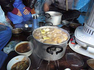 薬師岳 11朝6時起床!皆さんの口から出る言葉… 「う~ん、頭痛~い!食欲ない…。 ムカムカする。吐きそう…。歩きたくない…」。 どうやら全員重症のようです。 実は、私も完全に二日酔い状態でした。 具たくさんのうどんを食べます。2012年2月19日撮影 |