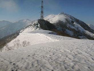 貝吹岳~笹森山~国見温泉 5左から2つ目の小ピークが目指す貝吹岳です。 どんどん近づいて参りました。2012年4月15日撮影 |