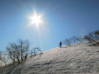 貝吹岳~笹森山~国見温泉 2参加者が誰もいなければ単独で行こう!と 思っていましたが、北上のMさんより 「ぜひ、参加させてください!」と参加表明!よって、私とそのMさんと二人で行ってきました。 貝吹岳の登り、かなり急登でした。 トレースに従って登ったら激急登の 尾根に入り込んでしまったようです。 2012年4月15日撮影 |