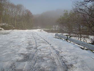 真昼山地・女神山 5「これほど林道歩きが楽しく思えたことがない!」 と思うほど美しい光景でした。林道は雪に覆われ銀世界、山の木々は 新緑が芽吹きその緑が目に眩しいくらい、 そして朝陽に輝く川のせせらぎ、 その中間にモヤ(霧)が立ち込め 「幽玄の世界」を醸し出していました。 2012年5月6日撮影 |