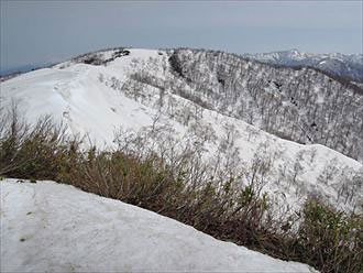 白岩岳 12この白岩岳~白岩薬師間の主稜線の 縦走が最高に楽しかったです♪ 展望最高!和賀山塊の山々がグルリと 見渡せ秋田駒ケ岳や鳥海山まで見えました。 遠方に和賀岳(左)、小杉山分岐(右)を望む。 2013年5月10日撮影 |