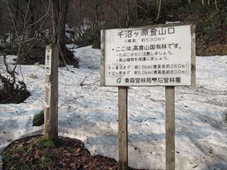 三角山 2滝ノ上温泉の数キロ手前にある登山口にて。 朝7時、ここより登り始めます。 千沼ヶ原から三角山の間は、登山道がなく 積雪期限定ルートとなります。2014年4月26日撮影 |