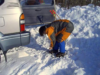 赤林山 1南昌山塊のうち最も盛岡よりに位置する 赤林山。矢巾温泉を拠点に枝尾根に取り付き、矢巾町から雫石に抜ける南昌 第二トンネルの真上を横切って登って 行きます。標高の割には顕著な尾根をなし 雪山気分を満喫できる好ルートです。 車を矢巾温泉の駐車場にデポして、 ワカンを装着!いざ出発♪ 身支度しているえるさんです。 2006年1月7日撮影 |