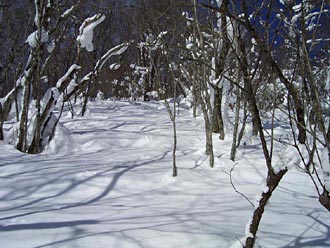 赤林山 4志和三山というのは、本当は東根山 南昌山・赤林山を指すようですが 縦走の場合は、赤林山の代わりに 箱ガ森山が取って代わるようです。登りはじめから急登が続きます。 最初はトレースらしきものがうっすらと ありましたが、それも次第に無くなり その後は、ラッセルとなりました。 2006年1月7日撮影 |