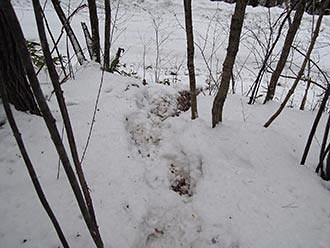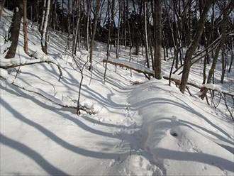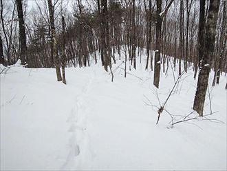 建石山 6寒風山からメインの建石山を目指しますが、 こちらの方も、ヤブっぽくってこんな感じ。2万5千図によると、ここにも登山道が あるハズなのですが…。分からず、 雪を利用して適当に歩きました。 2014年12月28日撮影 |