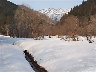 大石岳 8前回3月12日の時は、標高290mの沢の 徒渉点が渡れず敗退しました。今回は春の雪解けで前回 よりも水量が多いのは明白! しかも、気温が異常なほどに高い! 果たして渡渉できるのか? 2017年4月6日撮影 |